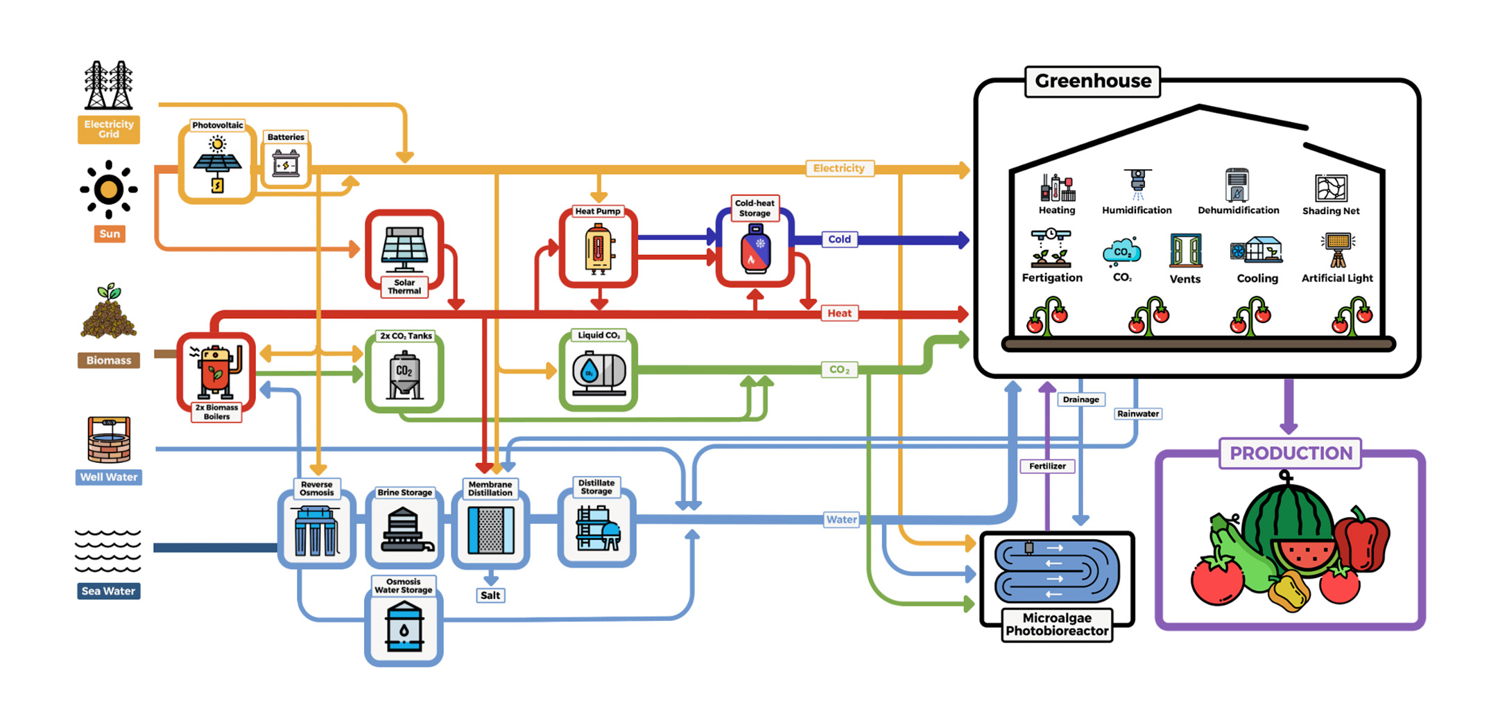 - Production System: Traditional greenhouse (hydroponics and conventional) with technologies to generate, save, and efficiently use energy, water, and CO₂.